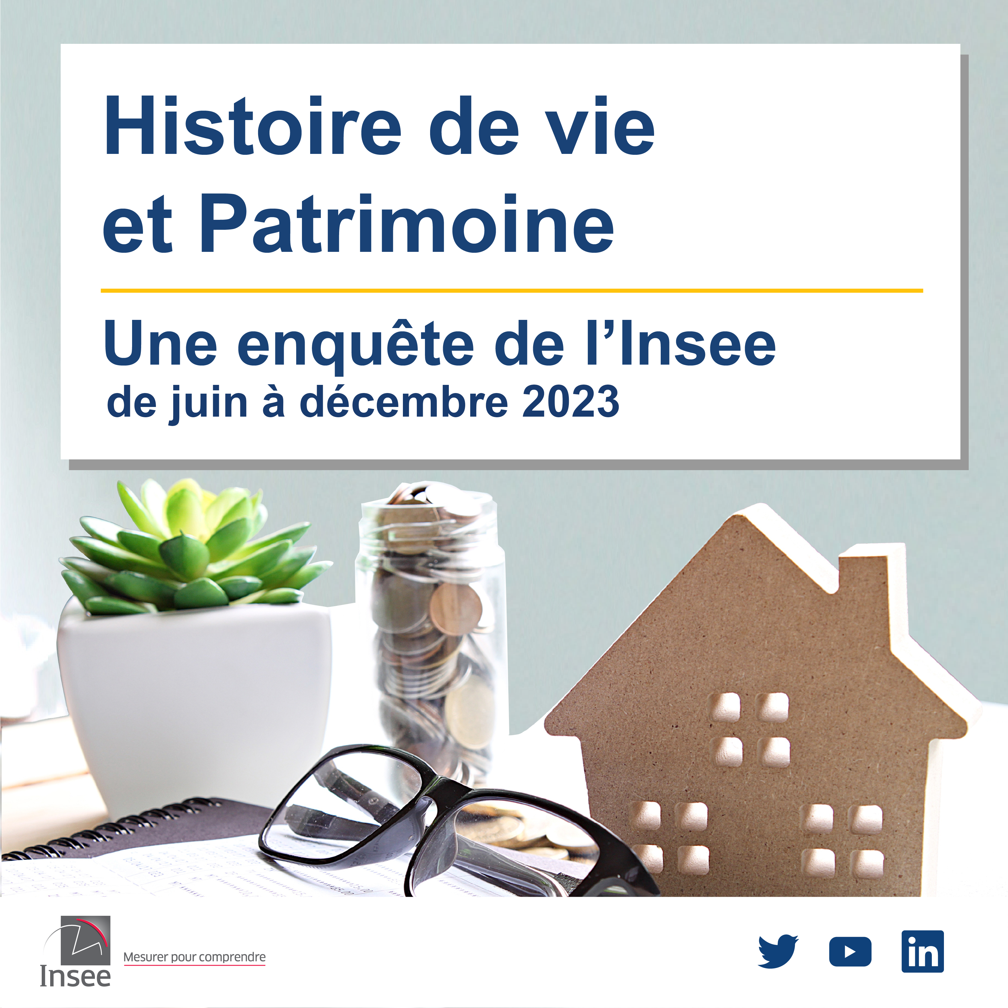Depuis le 12 juin 2023, l'Insee réalise une enquête statistique sur l’histoire de vie et le patrimoine des ménages auprès des français. Cette enquête interroge les ménages sur leurs biens immobiliers, financiers et professionnels, et sur leur endettement ; ainsi que sur leur histoire personnelle (héritages et donations, formation du ménage, carrière professionnelle).