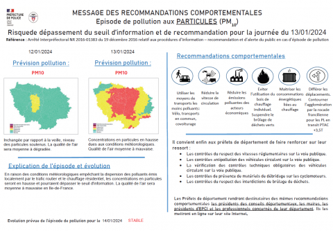 Retrouvez l'ensemble des informations sur le site de la Préfecture des Yvelines dans leur article détaillé : https://www.yvelines.gouv.fr/Actualites/Episode-de-pollution-aux-particules-en-Ile-de-France-pour-le-samedi-13-janvier-2024