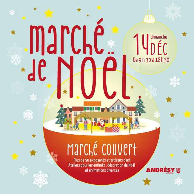 Chaque année, la Ville d'Andrésy organise son Marché de Noël, très apprécié des habitants, c'est l'occasion parfaite pour faire ses achats de Noël dans une ambiance féérique sous les halles du marché en bord de Seine.